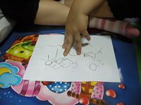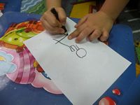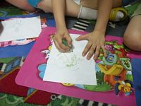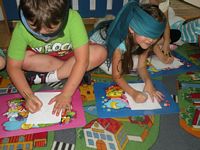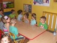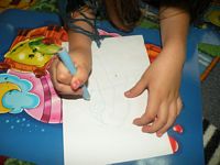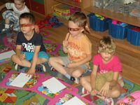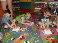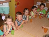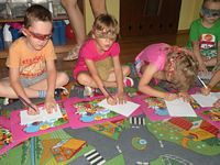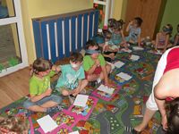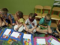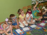 Nie małym wyzwaniem dla naszych Promyczków było narysowanie siebie – dla utrudnienia miały one zawiązane oczy.