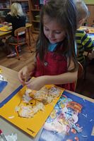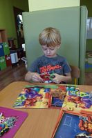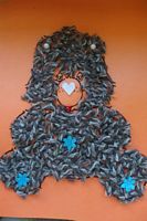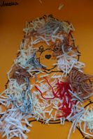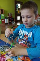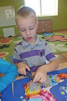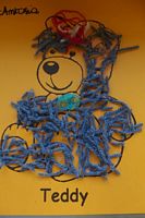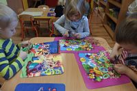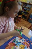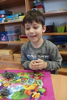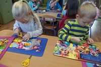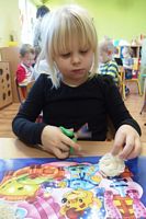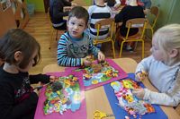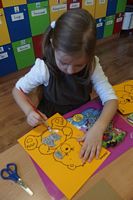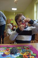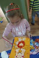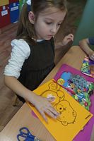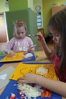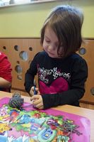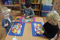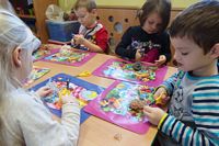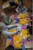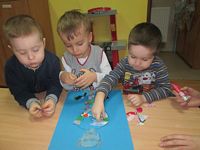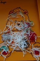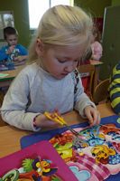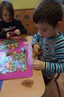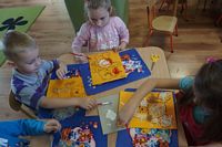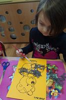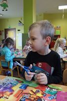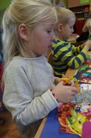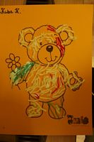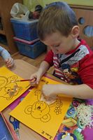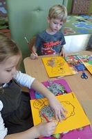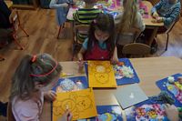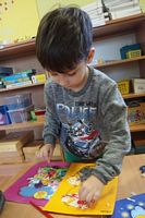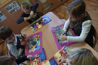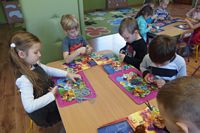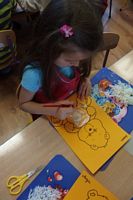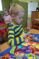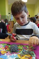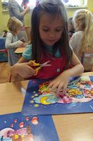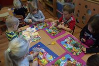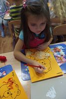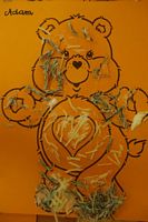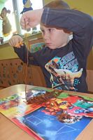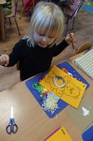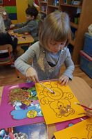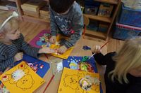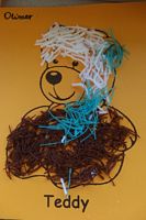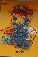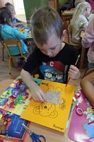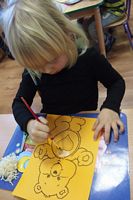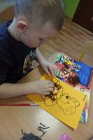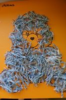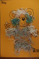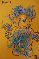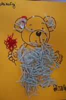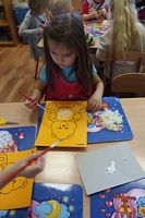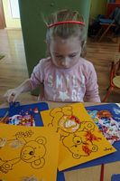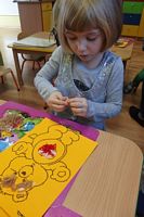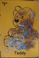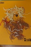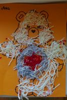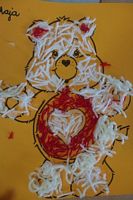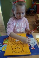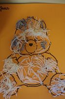 Dzieci wyklejały obrazki misia kolorowymi włóczkamina na zajęciach plastycznych .